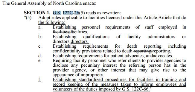 - Enhances punishment from Class 1 Misdemeanor to A1 Misdemeanor for “knowingly causes pain or injury to a client” – except for “accepted medical or therapeutic procedures.”