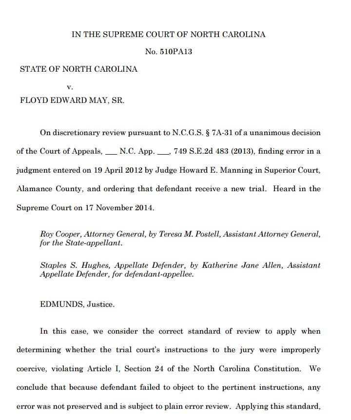 Caselaw Summary for North Carolina Supreme Court – North Carolina v. May