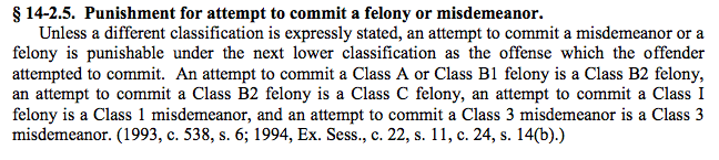 In North Carolina, an attempt to commit a crime has two elements: (1) intent to commit the crime, and (2) an overt act done for that purpose, going beyond mere preparation, but falling short of the completed offense. State v. Powell, 277 N.C. 672, 678, 178 S.E.2d 417, 421 (1971). Under North Carolina structured sentencing, an attempt crime is punishable by the next lower classification as the offense that the offender attempted to commit. N.C.G.S. § 14-2.5 (2015).