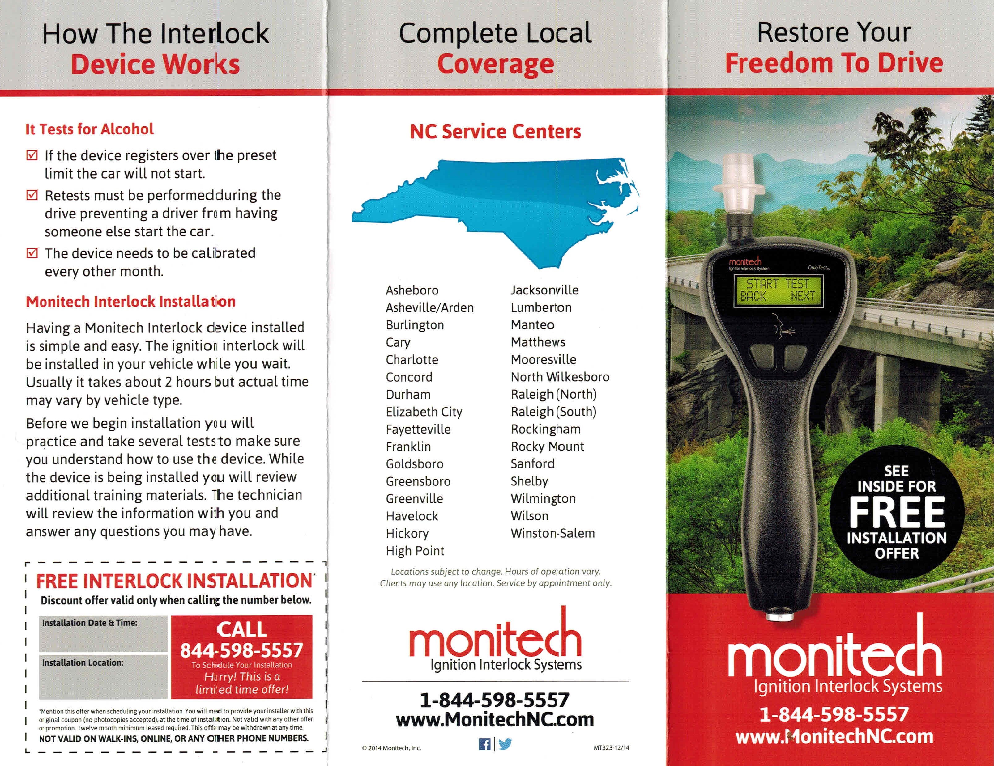 Monitech recently forwarded to our office the attached brochure, requesting we let clients know there is presently in place a Free Installation offer. Powers Law Firm PA does not expressly endorse one company over another. Indeed, we regularly serve as legal counsel to clients whom have been accused of consuming alcohol and driving, necessitating a challenge to the accuracy of such devices in court and are further called to cross-examine Monitech employees regarding installation errors, datum dumps, reporting errors and false readings.