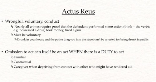 - Actus Reus is often proven by the same evidence that proves identity (ex. eyewitness testimony)