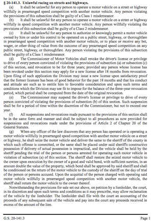 For specifics review the North Carolina General Statute § 20-141.3 “Unlawful racing on streets and highways.”